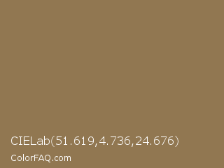 CIELab 51.619,4.736,24.676 Color is a normal orange color and the nearest color is Pale Brown #987654. Hex code #917751 and RGB value is rgb(145,119,81). In RGB color space, this color is composed of 57% red, 47% green, 32% blue, In CMYK color space, this color is composed of 0% cyan, 18% magenta, 44% yellow , 43% black , In HSL color space, this color has a hue angle of 36° , 28% saturation and 44% lightness.