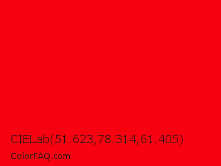CIELab 51.623,78.314,61.405 Color is a normal red color and the nearest color is KU Crimson #e8000d. Hex code #f70010 and RGB value is rgb(247,0,16). In RGB color space, this color is composed of 97% red, 0% green, 6% blue, In CMYK color space, this color is composed of 0% cyan, 100% magenta, 94% yellow , 3% black , In HSL color space, this color has a hue angle of 356° , 100% saturation and 48% lightness.