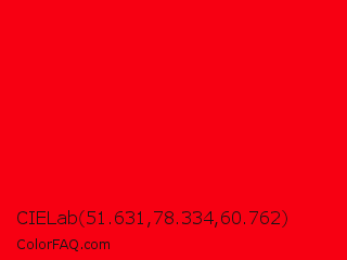 CIELab 51.631,78.334,60.762 Color is a normal red color and the nearest color is Vivid Red #f70d1a. Hex code #f70012 and RGB value is rgb(247,0,18). In RGB color space, this color is composed of 97% red, 0% green, 7% blue, In CMYK color space, this color is composed of 0% cyan, 100% magenta, 93% yellow , 3% black , In HSL color space, this color has a hue angle of 356° , 100% saturation and 48% lightness.