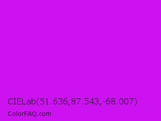 CIELab 51.636,87.543,-68.007 Color is a normal purple color and the nearest color is Vivid Orchid #cc00ff. Hex code #cd12f2 and RGB value is rgb(205,18,242). In RGB color space, this color is composed of 80% red, 7% green, 95% blue, In CMYK color space, this color is composed of 15% cyan, 93% magenta, 0% yellow , 5% black , In HSL color space, this color has a hue angle of 290° , 90% saturation and 51% lightness.
