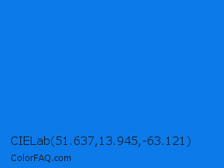 CIELab 51.637,13.945,-63.121 Color is a normal blue color and the nearest color is Bright Navy Blue #1974d2. Hex code #0c7ae8 and RGB value is rgb(12,122,232). In RGB color space, this color is composed of 5% red, 48% green, 91% blue, In CMYK color space, this color is composed of 95% cyan, 47% magenta, 0% yellow , 9% black , In HSL color space, this color has a hue angle of 210° , 90% saturation and 48% lightness.