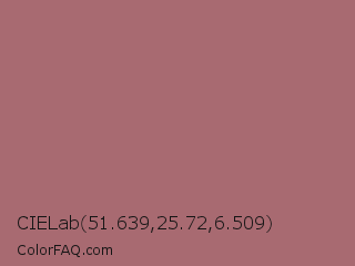 CIELab 51.639,25.72,6.509 Color is a normal red color and the nearest color is Coral Tree #a86b6b. Hex code #a86a71 and RGB value is rgb(168,106,113). In RGB color space, this color is composed of 66% red, 42% green, 44% blue, In CMYK color space, this color is composed of 0% cyan, 37% magenta, 33% yellow , 34% black , In HSL color space, this color has a hue angle of 353° , 26% saturation and 54% lightness.