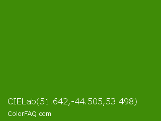 CIELab 51.642,-44.505,53.498 Color is a dark green color and the nearest color is La Palma #368716. Hex code #3f8c07 and RGB value is rgb(63,140,7). In RGB color space, this color is composed of 25% red, 55% green, 3% blue, In CMYK color space, this color is composed of 55% cyan, 0% magenta, 95% yellow , 45% black , In HSL color space, this color has a hue angle of 95° , 90% saturation and 29% lightness.