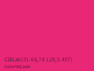 CIELab 51.64,74.129,5.457 Color is a normal rose color and the nearest color is Razzmatazz #e3256b. Hex code #e82675 and RGB value is rgb(232,38,117). In RGB color space, this color is composed of 91% red, 15% green, 46% blue, In CMYK color space, this color is composed of 0% cyan, 84% magenta, 50% yellow , 9% black , In HSL color space, this color has a hue angle of 336° , 81% saturation and 53% lightness.