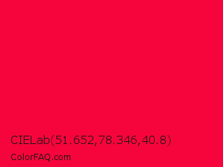 CIELab 51.652,78.346,40.8 Color is a normal red color and the nearest color is Red Munsell #f2003c. Hex code #f5053b and RGB value is rgb(245,5,59). In RGB color space, this color is composed of 96% red, 2% green, 23% blue, In CMYK color space, this color is composed of 0% cyan, 98% magenta, 76% yellow , 4% black , In HSL color space, this color has a hue angle of 347° , 96% saturation and 49% lightness.