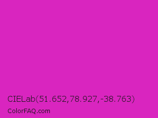 CIELab 51.652,78.927,-38.763 Color is a normal magenta color and the nearest color is Steel Pink #cc33cc. Hex code #d925bf and RGB value is rgb(217,37,191). In RGB color space, this color is composed of 85% red, 15% green, 75% blue, In CMYK color space, this color is composed of 0% cyan, 83% magenta, 12% yellow , 15% black , In HSL color space, this color has a hue angle of 309° , 71% saturation and 50% lightness.
