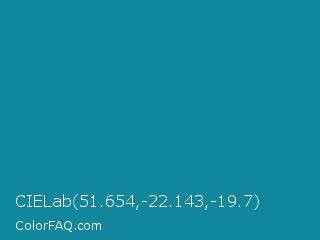 CIELab 51.654,-22.143,-19.7 Color is a normal cyan color and the nearest color is Blue Chill #0c8990. Hex code #10879c and RGB value is rgb(16,135,156). In RGB color space, this color is composed of 6% red, 53% green, 61% blue, In CMYK color space, this color is composed of 90% cyan, 13% magenta, 0% yellow , 39% black , In HSL color space, this color has a hue angle of 189° , 81% saturation and 34% lightness.