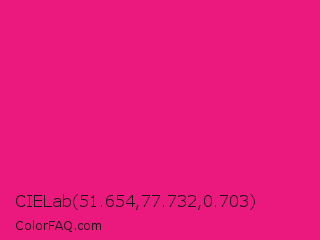 CIELab 51.654,77.732,0.703 Color is a normal rose color and the nearest color is Vivid Cerise #da1d81. Hex code #eb197d and RGB value is rgb(235,25,125). In RGB color space, this color is composed of 92% red, 10% green, 49% blue, In CMYK color space, this color is composed of 0% cyan, 89% magenta, 47% yellow , 8% black , In HSL color space, this color has a hue angle of 331° , 84% saturation and 51% lightness.
