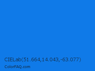 CIELab 51.664,14.043,-63.077 Color is a normal blue color and the nearest color is Bright Navy Blue #1974d2. Hex code #0f7ae8 and RGB value is rgb(15,122,232). In RGB color space, this color is composed of 6% red, 48% green, 91% blue, In CMYK color space, this color is composed of 94% cyan, 47% magenta, 0% yellow , 9% black , In HSL color space, this color has a hue angle of 210° , 88% saturation and 48% lightness.