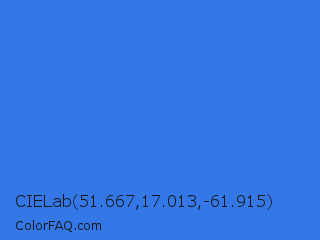 CIELab 51.667,17.013,-61.915 Color is a normal blue color and the nearest color is Bleu De France #318ce7. Hex code #3378e6 and RGB value is rgb(51,120,230). In RGB color space, this color is composed of 20% red, 47% green, 90% blue, In CMYK color space, this color is composed of 78% cyan, 48% magenta, 0% yellow , 10% black , In HSL color space, this color has a hue angle of 217° , 78% saturation and 55% lightness.