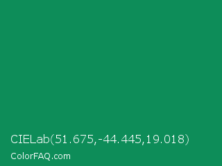 CIELab 51.675,-44.445,19.018 Color is a dark green color and the nearest color is Spanish Green #009150. Hex code #0d8d59 and RGB value is rgb(13,141,89). In RGB color space, this color is composed of 5% red, 55% green, 35% blue, In CMYK color space, this color is composed of 91% cyan, 0% magenta, 37% yellow , 45% black , In HSL color space, this color has a hue angle of 156° , 83% saturation and 30% lightness.