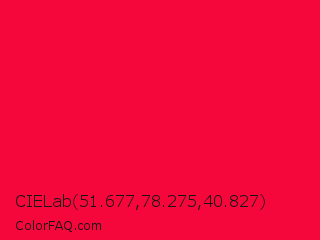 CIELab 51.677,78.275,40.827 Color is a normal red color and the nearest color is Red Munsell #f2003c. Hex code #f5063b and RGB value is rgb(245,6,59). In RGB color space, this color is composed of 96% red, 2% green, 23% blue, In CMYK color space, this color is composed of 0% cyan, 98% magenta, 76% yellow , 4% black , In HSL color space, this color has a hue angle of 347° , 95% saturation and 49% lightness.