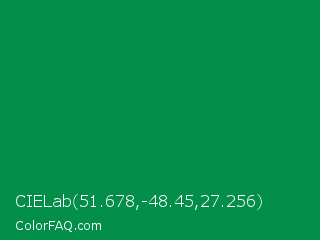CIELab 51.678,-48.45,27.256 Color is a dark green color and the nearest color is Spanish Green #009150. Hex code #038e4a and RGB value is rgb(3,142,74). In RGB color space, this color is composed of 1% red, 56% green, 29% blue, In CMYK color space, this color is composed of 98% cyan, 0% magenta, 48% yellow , 44% black , In HSL color space, this color has a hue angle of 151° , 96% saturation and 28% lightness.