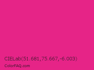 CIELab 51.681,75.667,-6.003 Color is a normal rose color and the nearest color is Barbie Pink #e0218a. Hex code #e62488 and RGB value is rgb(230,36,136). In RGB color space, this color is composed of 90% red, 14% green, 53% blue, In CMYK color space, this color is composed of 0% cyan, 84% magenta, 41% yellow , 10% black , In HSL color space, this color has a hue angle of 329° , 80% saturation and 52% lightness.
