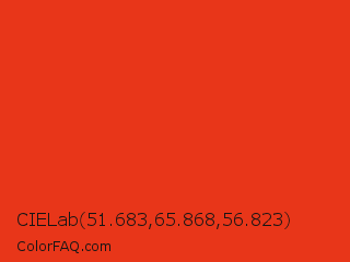 CIELab 51.683,65.868,56.823 Color is a normal red color and the nearest color is Vermilion #d9381e. Hex code #e83619 and RGB value is rgb(232,54,25). In RGB color space, this color is composed of 91% red, 21% green, 10% blue, In CMYK color space, this color is composed of 0% cyan, 77% magenta, 89% yellow , 9% black , In HSL color space, this color has a hue angle of 8° , 82% saturation and 50% lightness.