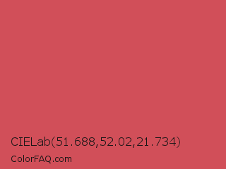 CIELab 51.688,52.02,21.734 Color is a normal red color and the nearest color is Dark Terra Cotta #cc4e5c. Hex code #d14f59 and RGB value is rgb(209,79,89). In RGB color space, this color is composed of 82% red, 31% green, 35% blue, In CMYK color space, this color is composed of 0% cyan, 62% magenta, 57% yellow , 18% black , In HSL color space, this color has a hue angle of 355° , 59% saturation and 56% lightness.