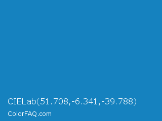 CIELab 51.708,-6.341,-39.788 Color is a normal blue color and the nearest color is Cyan Cornflower Blue #188bc2. Hex code #1582bf and RGB value is rgb(21,130,191). In RGB color space, this color is composed of 8% red, 51% green, 75% blue, In CMYK color space, this color is composed of 89% cyan, 32% magenta, 0% yellow , 25% black , In HSL color space, this color has a hue angle of 202° , 80% saturation and 42% lightness.