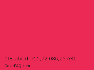 CIELab 51.711,72.086,25.63 Color is a normal red color and the nearest color is Amaranth #e52b50. Hex code #eb2954 and RGB value is rgb(235,41,84). In RGB color space, this color is composed of 92% red, 16% green, 33% blue, In CMYK color space, this color is composed of 0% cyan, 83% magenta, 64% yellow , 8% black , In HSL color space, this color has a hue angle of 347° , 83% saturation and 54% lightness.