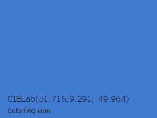 CIELab 51.716,9.291,-49.964 Color is a normal blue color and the nearest color is Han Blue #446ccf. Hex code #417bd1 and RGB value is rgb(65,123,209). In RGB color space, this color is composed of 25% red, 48% green, 82% blue, In CMYK color space, this color is composed of 69% cyan, 41% magenta, 0% yellow , 18% black , In HSL color space, this color has a hue angle of 216° , 61% saturation and 54% lightness.