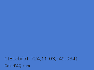 CIELab 51.724,11.03,-49.934 Color is a normal blue color and the nearest color is Han Blue #446ccf. Hex code #487ad1 and RGB value is rgb(72,122,209). In RGB color space, this color is composed of 28% red, 48% green, 82% blue, In CMYK color space, this color is composed of 66% cyan, 42% magenta, 0% yellow , 18% black , In HSL color space, this color has a hue angle of 218° , 60% saturation and 55% lightness.