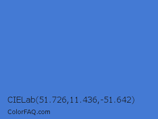 CIELab 51.726,11.436,-51.642 Color is a normal blue color and the nearest color is Han Blue #446ccf. Hex code #447ad4 and RGB value is rgb(68,122,212). In RGB color space, this color is composed of 27% red, 48% green, 83% blue, In CMYK color space, this color is composed of 68% cyan, 42% magenta, 0% yellow , 17% black , In HSL color space, this color has a hue angle of 218° , 63% saturation and 55% lightness.