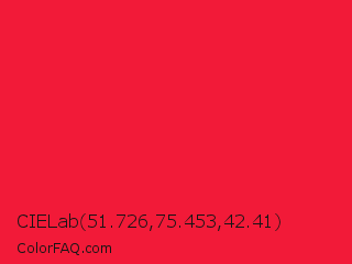 CIELab 51.726,75.453,42.41 Color is a normal red color and the nearest color is Imperial Red #ed2939. Hex code #f21a38 and RGB value is rgb(242,26,56). In RGB color space, this color is composed of 95% red, 10% green, 22% blue, In CMYK color space, this color is composed of 0% cyan, 89% magenta, 77% yellow , 5% black , In HSL color space, this color has a hue angle of 352° , 89% saturation and 53% lightness.