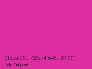 CIELab 51.729,74.648,-20.99 Color is a normal magenta color and the nearest color is Frostbite #e936a7. Hex code #de2ca1 and RGB value is rgb(222,44,161). In RGB color space, this color is composed of 87% red, 17% green, 63% blue, In CMYK color space, this color is composed of 0% cyan, 80% magenta, 27% yellow , 13% black , In HSL color space, this color has a hue angle of 321° , 73% saturation and 52% lightness.