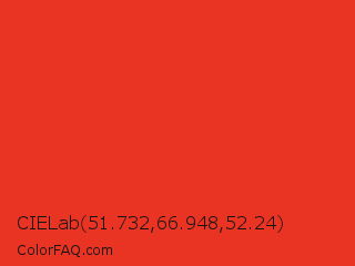CIELab 51.732,66.948,52.24 Color is a normal red color and the nearest color is Permanent Geranium Lake #e12c2c. Hex code #e93424 and RGB value is rgb(233,52,36). In RGB color space, this color is composed of 91% red, 20% green, 14% blue, In CMYK color space, this color is composed of 0% cyan, 78% magenta, 85% yellow , 9% black , In HSL color space, this color has a hue angle of 5° , 82% saturation and 53% lightness.