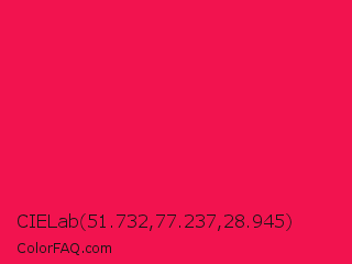 CIELab 51.732,77.237,28.945 Color is a normal rose color and the nearest color is Red Crayola #ee204d. Hex code #f2134f and RGB value is rgb(242,19,79). In RGB color space, this color is composed of 95% red, 7% green, 31% blue, In CMYK color space, this color is composed of 0% cyan, 92% magenta, 67% yellow , 5% black , In HSL color space, this color has a hue angle of 344° , 90% saturation and 51% lightness.
