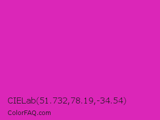 CIELab 51.732,78.19,-34.54 Color is a normal magenta color and the nearest color is Frostbite #e936a7. Hex code #db26b8 and RGB value is rgb(219,38,184). In RGB color space, this color is composed of 86% red, 15% green, 72% blue, In CMYK color space, this color is composed of 0% cyan, 83% magenta, 16% yellow , 14% black , In HSL color space, this color has a hue angle of 312° , 72% saturation and 50% lightness.