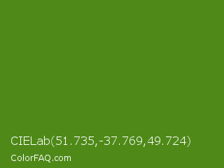 CIELab 51.735,-37.769,49.724 Color is a normal green color and the nearest color is Vida Loca #549019. Hex code #4f8a19 and RGB value is rgb(79,138,25). In RGB color space, this color is composed of 31% red, 54% green, 10% blue, In CMYK color space, this color is composed of 43% cyan, 0% magenta, 82% yellow , 46% black , In HSL color space, this color has a hue angle of 91° , 69% saturation and 32% lightness.