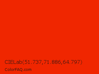CIELab 51.737,71.886,64.797 Color is a normal red color and the nearest color is Ferrari Red #ff2800. Hex code #f02600 and RGB value is rgb(240,38,0). In RGB color space, this color is composed of 94% red, 15% green, 0% blue, In CMYK color space, this color is composed of 0% cyan, 84% magenta, 100% yellow , 6% black , In HSL color space, this color has a hue angle of 10° , 100% saturation and 47% lightness.