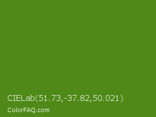 CIELab 51.73,-37.82,50.021 Color is a normal green color and the nearest color is Vida Loca #549019. Hex code #4f8a18 and RGB value is rgb(79,138,24). In RGB color space, this color is composed of 31% red, 54% green, 9% blue, In CMYK color space, this color is composed of 43% cyan, 0% magenta, 83% yellow , 46% black , In HSL color space, this color has a hue angle of 91° , 70% saturation and 32% lightness.