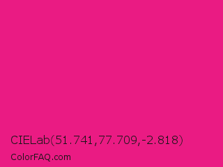 CIELab 51.741,77.709,-2.818 Color is a normal rose color and the nearest color is Barbie Pink #e0218a. Hex code #ea1b83 and RGB value is rgb(234,27,131). In RGB color space, this color is composed of 92% red, 11% green, 51% blue, In CMYK color space, this color is composed of 0% cyan, 88% magenta, 44% yellow , 8% black , In HSL color space, this color has a hue angle of 330° , 83% saturation and 51% lightness.