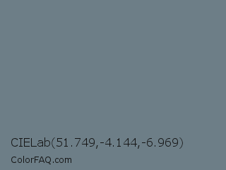 CIELab 51.749,-4.144,-6.969 Color is a normal blue color and the nearest color is Raven #727b89. Hex code #6d7e87 and RGB value is rgb(109,126,135). In RGB color space, this color is composed of 43% red, 49% green, 53% blue, In CMYK color space, this color is composed of 19% cyan, 7% magenta, 0% yellow , 47% black , In HSL color space, this color has a hue angle of 201° , 11% saturation and 48% lightness.