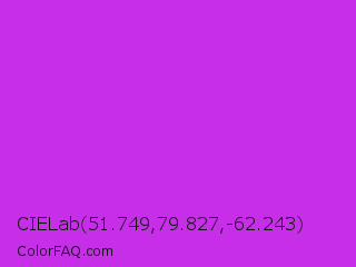CIELab 51.749,79.827,-62.243 Color is a normal purple color and the nearest color is Steel Pink #cc33cc. Hex code #c72ee8 and RGB value is rgb(199,46,232). In RGB color space, this color is composed of 78% red, 18% green, 91% blue, In CMYK color space, this color is composed of 14% cyan, 80% magenta, 0% yellow , 9% black , In HSL color space, this color has a hue angle of 289° , 80% saturation and 55% lightness.