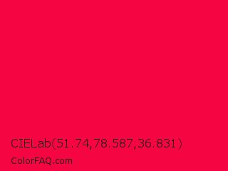 CIELab 51.74,78.587,36.831 Color is a normal red color and the nearest color is Red Munsell #f2003c. Hex code #f50542 and RGB value is rgb(245,5,66). In RGB color space, this color is composed of 96% red, 2% green, 26% blue, In CMYK color space, this color is composed of 0% cyan, 98% magenta, 73% yellow , 4% black , In HSL color space, this color has a hue angle of 345° , 96% saturation and 49% lightness.