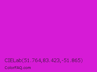 CIELab 51.764,83.423,-51.865 Color is a normal magenta color and the nearest color is Steel Pink #cc33cc. Hex code #d61bd6 and RGB value is rgb(214,27,214). In RGB color space, this color is composed of 84% red, 11% green, 84% blue, In CMYK color space, this color is composed of 0% cyan, 87% magenta, 0% yellow , 16% black , In HSL color space, this color has a hue angle of 300° , 78% saturation and 47% lightness.