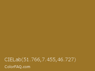 CIELab 51.766,7.455,46.727 Color is a normal orange color and the nearest color is Reef Gold #9f821c. Hex code #9c7527 and RGB value is rgb(156,117,39). In RGB color space, this color is composed of 61% red, 46% green, 15% blue, In CMYK color space, this color is composed of 0% cyan, 25% magenta, 75% yellow , 39% black , In HSL color space, this color has a hue angle of 40° , 60% saturation and 38% lightness.