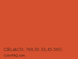CIELab 51.769,50.33,45.565 Color is a normal red color and the nearest color is Valencia #d84437. Hex code #d4502f and RGB value is rgb(212,80,47). In RGB color space, this color is composed of 83% red, 31% green, 18% blue, In CMYK color space, this color is composed of 0% cyan, 62% magenta, 78% yellow , 17% black , In HSL color space, this color has a hue angle of 12° , 66% saturation and 51% lightness.