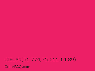CIELab 51.774,75.611,14.89 Color is a normal rose color and the nearest color is Razzmatazz #e3256b. Hex code #ed1f66 and RGB value is rgb(237,31,102). In RGB color space, this color is composed of 93% red, 12% green, 40% blue, In CMYK color space, this color is composed of 0% cyan, 87% magenta, 57% yellow , 7% black , In HSL color space, this color has a hue angle of 339° , 85% saturation and 53% lightness.