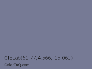 CIELab 51.77,4.566,-15.061 Color is a normal blue color and the nearest color is Rhythm #777696. Hex code #767a95 and RGB value is rgb(118,122,149). In RGB color space, this color is composed of 46% red, 48% green, 58% blue, In CMYK color space, this color is composed of 21% cyan, 18% magenta, 0% yellow , 42% black , In HSL color space, this color has a hue angle of 232° , 13% saturation and 52% lightness.
