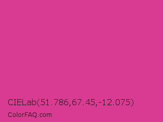 CIELab 51.786,67.45,-12.075 Color is a normal magenta color and the nearest color is Pink Pantone #d74894. Hex code #d93b92 and RGB value is rgb(217,59,146). In RGB color space, this color is composed of 85% red, 23% green, 57% blue, In CMYK color space, this color is composed of 0% cyan, 73% magenta, 33% yellow , 15% black , In HSL color space, this color has a hue angle of 327° , 68% saturation and 54% lightness.