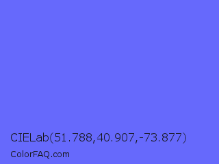 CIELab 51.788,40.907,-73.877 Color is a light blue color and the nearest color is Very Light Blue #6666ff. Hex code #6669fc and RGB value is rgb(102,105,252). In RGB color space, this color is composed of 40% red, 41% green, 99% blue, In CMYK color space, this color is composed of 60% cyan, 58% magenta, 0% yellow , 1% black , In HSL color space, this color has a hue angle of 239° , 96% saturation and 69% lightness.