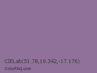 CIELab 51.78,19.342,-17.176 Color is a normal purple color and the nearest color is Trendy Pink #8c6495. Hex code #8f7199 and RGB value is rgb(143,113,153). In RGB color space, this color is composed of 56% red, 44% green, 60% blue, In CMYK color space, this color is composed of 7% cyan, 26% magenta, 0% yellow , 40% black , In HSL color space, this color has a hue angle of 285° , 16% saturation and 52% lightness.