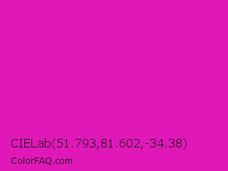 CIELab 51.793,81.602,-34.38 Color is a normal magenta color and the nearest color is Shocking Pink #fc0fc0. Hex code #e018b8 and RGB value is rgb(224,24,184). In RGB color space, this color is composed of 88% red, 9% green, 72% blue, In CMYK color space, this color is composed of 0% cyan, 89% magenta, 18% yellow , 12% black , In HSL color space, this color has a hue angle of 312° , 81% saturation and 49% lightness.