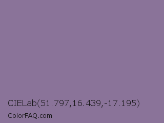 CIELab 51.797,16.439,-17.195 Color is a normal purple color and the nearest color is Trendy Pink #8c6495. Hex code #8a7399 and RGB value is rgb(138,115,153). In RGB color space, this color is composed of 54% red, 45% green, 60% blue, In CMYK color space, this color is composed of 10% cyan, 25% magenta, 0% yellow , 40% black , In HSL color space, this color has a hue angle of 276° , 16% saturation and 53% lightness.