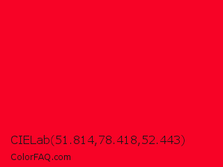 CIELab 51.814,78.418,52.443 Color is a normal red color and the nearest color is Ruddy #ff0028. Hex code #f70326 and RGB value is rgb(247,3,38). In RGB color space, this color is composed of 97% red, 1% green, 15% blue, In CMYK color space, this color is composed of 0% cyan, 99% magenta, 85% yellow , 3% black , In HSL color space, this color has a hue angle of 351° , 98% saturation and 49% lightness.