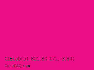CIELab 51.821,80.171,-3.84 Color is a normal rose color and the nearest color is Mexican Pink #e4007c. Hex code #ed0d85 and RGB value is rgb(237,13,133). In RGB color space, this color is composed of 93% red, 5% green, 52% blue, In CMYK color space, this color is composed of 0% cyan, 95% magenta, 44% yellow , 7% black , In HSL color space, this color has a hue angle of 328° , 90% saturation and 49% lightness.