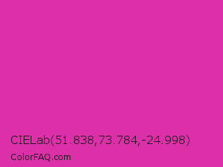 CIELab 51.838,73.784,-24.998 Color is a normal magenta color and the nearest color is Frostbite #e936a7. Hex code #db30a8 and RGB value is rgb(219,48,168). In RGB color space, this color is composed of 86% red, 19% green, 66% blue, In CMYK color space, this color is composed of 0% cyan, 78% magenta, 23% yellow , 14% black , In HSL color space, this color has a hue angle of 318° , 70% saturation and 52% lightness.